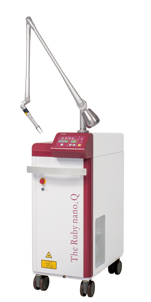 当院ではThe Ruby nano_Q(JMEC社:日本製、厚生労働省承認機)のQスイッチルビーレーザーを導入しています。しみ・あざ等のメラニンが原因となる疾患の治療に対して、極めて効果が高いルビーレーザーです。メラニンの異常組織だけを破壊し、コラーゲンやヘモグロビンの正常皮膚組織には極力ダメージを与えず治療が行えます。