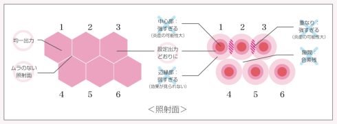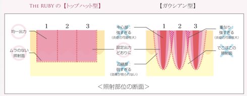 またトップハット型の均ーなパワーモードで、他社のガウシアン型などのようなエネルギーのムラがありません。治療した際にできる創面が均一になり、治癒が早く、 炎症が軽度ですみます。